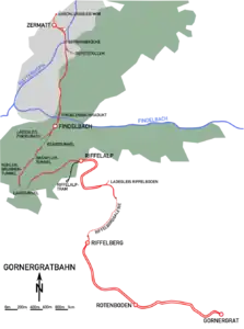 На линии расположены два моста (оба между Церматтом и Финдельбахом), четыре тоннеля (самый длинный — 179 м), все между Финдельбахом и Риффельальпом, и крытая галерея длиной 770 м между Риффельбоденом и Риффельбергом.