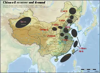 Крупнейшим месторождением нефти в Китае является Дацин на северо-востоке страны. Крупные месторождения имеются на северо-западе (Таримский нефтегазоносный бассейн, Карамай), а также в провинциях Сычуань, Шаньдун, Ляонин (Ляохэ) и Хэнань. Сланцевая нефть имеется в провинциях Ляонин и Фушунь. Морская нефтедобыча ведётся в Бохайском заливе (Бочжун, Кэньли, Луда) и других прилегающих акваториях (месторождения Вэйчжоу, Вэньчан, Луфэн). Несмотря на довольно высокий уровень добычи нефти КНР является одним из крупнейших её импортеров.