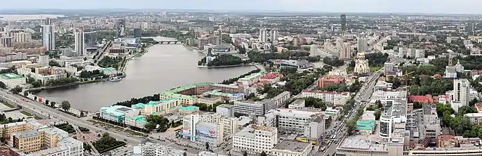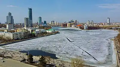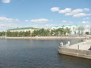 Берега пруда с XVIII века застраивались жилыми домами, фабриками, заводами. В начале 1930-х годов на левом берегу пруда по проекту архитектора В. Д. Соколова был построен спорткомплекс «Динамо» с главным зданием в виде корабля[7]. В 1990 году на правом берегу пруда был построен Свердловский государственный академический театр драмы. Также на правом берегу находятся бизнес-центры «Президент» и «Демидов-Плаза», 23-этажное здание администрации Свердловской области, Октябрьская площадь[1].