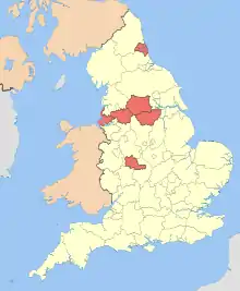 | Большой Манчестер | Манчестер, Болтон, Бери, Олдем, Рочдейл, Сити-оф-Солфорд, Стокпорт, Теймсайд, Траффорд, Уиган | 10 | 2,573,200 |