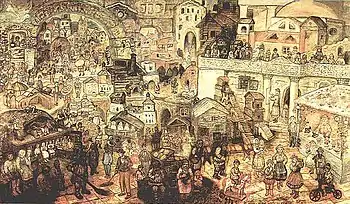 По-иному оценивает композицию картины Светлана Каткова. Она утверждает, что по горизонтали город, изображённый на картине, делится на три части. Первый ярус углублён, второй возвышается над ним, словно над обрывом, третий же скрыт за каменной стеной. Все ярусы соединяет «широкая лестница в три марша»[53]. Художник, по её мнению, разделил картину и по вертикали: справа он поместил усадебный дом с колоннами и террасой. Персонажи этой части картины одеты в городские костюмы. Слева преобладают сельские постройки, и персонажи одеты в деревенские наряды. По мнению Катковой, главенствуют здесь допетровские традиции (рубахи, онучи, армяки, сарафаны, все они собственного пошива из домотканого сукна, длинные бороды)[54]. На границе двух миров находятся цветок в горшке и молодой человек в синем костюме (в нём исследовательница угадывает мундир сотрудника НКВД послевоенного времени) с белым воротничком и в шляпе, а также «чёрная арка». В композиции картины Каткова увидела отчётливое противопоставление этих двух миров: бревенчатые избы и каменные дома, деревенские посиделки («беседы») и театральное представление в городе, затемнение переднего плана, где находится разобщённая семья сельчан, и выделение светом дружной семьи прогуливающихся горожан[55].