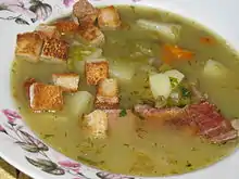 В Польше, России и на Украине в гороховый суп с копчёной свининой часто добавляют картофель. Восточноевропейский гороховый суп отличается бо́льшим количеством жидкости. Обычно подаётся с гренками или сухариками.