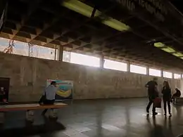 Стена перед выходом на площадку украшена скульптурой скульптора Левона Варданяна «Песня труда».