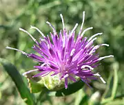 Соцветия — корзинки. Цветки тёмно-розовые. Цветение с июля до конца августа.