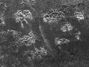 Горы Мисти на радарном снимке Титана (ширина — 300 км)