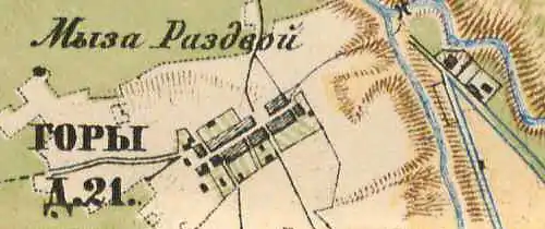 ГОРЫ — деревня владельческая при колодцах, число дворов — 50, число жителей: 147 м. п., 175 ж. п. (1862 год)[7]
