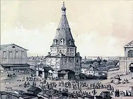 До перестройки Николо-Гостинодворская церковь представляла собой квадратное строение с высоким шатровым завершением. На литографии Э. Турнерелли 1839 года она запечатлена как квадратное в плане здание — массивный куб четверика с четырьмя маленькими главками по углам, на котором стоит низкий восьмерик с высоким шатром. Шатёр завершала небольшая чешуйчатая главка. Пирамиду шатра прорезали два ряда оконных проёмов.