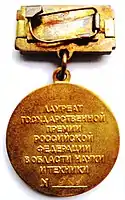 Лауреатам премии вручалась нагрудная медаль по образцу прежней медали лауреата Государственной премии СССР, планка медали имела окраску российского триколора[3].