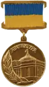 С помощью кольца с ушком медаль соединяется с фигурной колодкой, обтянутой шёлковой муаровой лентой с двумя равновеликими горизонтальными полосками синего и жёлтого цветов. Высота колодки — 23 мм, ширина — 28 мм. Размер ленты — 13×22 мм. На обратной стороне колодки — застёжка для прикрепления нагрудного знака к одежде.