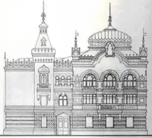 Народный дом строился в 1898—1900 годах. При его сооружении использовался фундамент бывшей тюрьмы (построена архитектором А. И. Молчановым), но по геометрическим размерам новое здание было значительно крупнее. Из-за нехватки денег замысел архитектора Ивана Ропета был воплощён не полностью[3]. Фасад решён в русском стиле, декорирован кокошниками, мелкими витыми колонками, «плетёнкой», наличниками, сложно профилированными тягами и другими мотивами, заимствованными в архитектуре Руси XVII века. Строительство велось без авторского надзора, с отклонениями от проекта. Сложенное из красного кирпича, оно несколько выбивалось из строгой, в духе классицизма, застройки Петропавловской улицы.