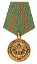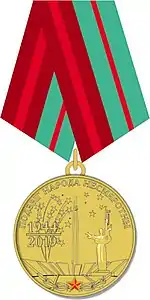 | Медаль «65 лет освобождения Республики Беларусь от немецко-фашистских захватчиков» | 4 декабря 2008 года[20] | В память об освобождении Белоруссии от фашистской Германии | Ветераны, иностранцы, принимавшие участие в освобождении Белоруссии от фашистов, а также военнослужащие Республики Беларусь и иные лица, «внесшие значительный вклад в героико-патриотическое воспитание граждан Республики Беларусь, увековечение памяти павших, организацию юбилейных мероприятий, посвященных 60-летию освобождения Республики Беларусь от немецко-фашистских захватчиков» | |