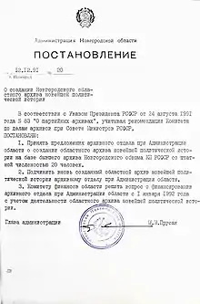 - Указ Президента РСФСР от 24.08.1991 г. № 83 «О партийных архивах»