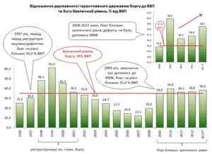 Согласно украинским и иностранным исследованиям, экономически безопасный уровень государственного и гарантированного государством долга для Украины сейчас составляет около 35% от ВВП.[26][27][28] Такой вывод базируется на статистике наступления дефолтов в странах с формирующимися рынками, (исследовано МВФ)[27] и на собственном опыте Украины, которая уже дважды была не в состоянии самостоятельно выполнять свои долговые обязательства при их приближении к уровню 30-35 % по отношению к ВВП[29] в частности, в конце 1990-х годов (что привело к нескольким реструктуризаций внутреннего государственного долга и реструктуризации внешнего государственного долга) и в конце 2000-х годов (что привело к обращению за помощью в международных финансовых организаций (сумма которой была второй по величине в мире после помощи МВФ для Венгрии).
