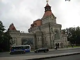 - Государственный мемориальный музей А. В. Суворова. Мозаичное панно на фасаде здания с картины А. Н. Попова "Переход русских войск через Альпы в 1799 году".