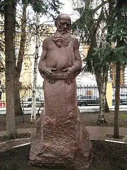 В 1972-м во дворе усадьбы на Пречистенке установили памятник Толстому, выполненный мастером Сергеем Меркуловым в 1911—1914-х годах[12]. Скульптор стремился передать философские и религиозные взгляды писателя через обтекаемость форм фигуры монумента. Однако памятник не понравился родственникам писателя и простоял в мастерской до 1928 года. Впоследствии его поместили на Девичье поле рядом с усадьбой Толстого в Хамовниках. Лишь в 1972 году памятник был установлен во дворе главного здания музея[13].