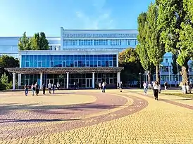 Б — учебно-библиотечный корпус. Здесь расположены лекционные аудитории и крупнейшая на Украине библиотека.