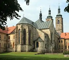 Архитектурный тип готического собора был принесён в Чехию в самом начале периода высокой готики монахами ордена цистерцианцев, однако этот тип по указанным выше причинам был впервые воплощён здесь не в форме городского собора, как во Франции, а в форме монастырского костёла. В Седлецком монастыре цистерцианцев близ Кутна-Горы в период с 1290 по 1320 годы был воздвигнут величественный готический храм, ныне известный как собор Вознесения Девы Марии и Святого Иоанна Крестителя. Готический стиль этого храма представляет собой комбинацию северофранцузской готической соборной архитектуры с немецкими готическими элементами. План и грандиозное внутреннее пространство храма отражает традиционный пафос французского готического собора: высота центрального из пяти его нефов составила 30 метров, его трансепт состоит из трёх нефов, а хор окружён обходом и венцом капелл. Седлецкий храм стал первым сооружением соборного типа и величайшим по размерам сакральным строением на территории Чехии и Моравии начала XIV века[14][12][23][24].