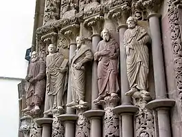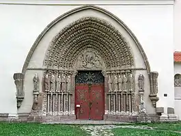 | «Небесные Врата» (лат. Porta Coeli) костёла Вознесения Девы Марии | Тимпан портала «Небесные Врата» с рельефным изображением Христа-Пантократора | Скульптуры апостолов на левом откосе портала |