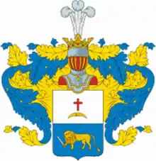 Описание герба: Выдержка из Общего гербовника Щит разделён горизонтально на две части, из коих в верхней в серебряном поле изображён красного цвета четырёхконечный крест и под ним луна, рогами вниз обращённая, а во второй части в голубом поле золотой лев, обращенный в правую сторону и держащий в правой лапе меч. Щит увенчан дворянским шлемом и короной с тремя страусовыми перьями. Намёт на щите голубой, подложен золотом. |