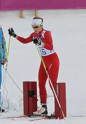 Использует лыжи и ботинки производства фирмы Rossignol.