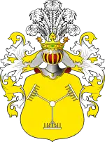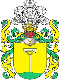 В золотом поле на трёх горах зелёного цвета белые грабли о семи зубцах. На шлеме пять страусовых перьев. Это знамя перенесено из Богемии при Венцеславе, короле Польском и Богемском. В некоторых гербах, напр, Ходзимирском, трое граблей, сходясь ручками в кольце, расходятся зубцами наподобие Y[1].