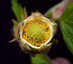 Цветки обоеполые, колокольчатые, пятичленные, поникающие (по отцветании прямостоячие), до 1—1,5 см в диаметре[4], в числе двух — трёх (пяти) на верхушке стебля, на длинных цветоносах, с двойным околоцветником; чашечка буровато-красная; лепестки широкие, тупые, на верхушке выемчатые, внезапно суженные в длинный ноготок, равные по длине чашелистикам, кремовые, реже жёлтые, с тёмно-красными жилками, железисто-мохнатые. Чашелистики прямостоячие. Тычинки многочисленные, волосистые. Многочисленные пестики собраны в яйцевидную головку, сидящую на опушённой ножке, удлиняющейся при созревании плодов. Верхний членик столбика до самой верхушки волосистый и почти равен нижнему. Цветоложе между тычинками представляет собой сплошную нектароносную ткань. Цветёт в конце весны и первой половине лета в течение 15—20 дней[4].