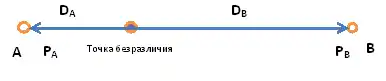Модель Рейли-Конверса позволяет найти точку безразличия (англ. breaking point) между двумя торговыми центрами, из которой покупатель с равной вероятностью пойдет в любой из двух торговых центров, где координаты точки безразличия определяются из расстояния до торгового центра и его торговой площади[8][9]: