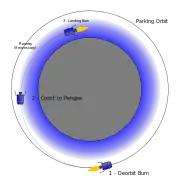 - В точке орбиты, противоположной району посадки космический аппарат притормаживает так, чтобы перицентр оказался несколько выше поверхности.