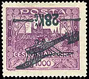 В том же году высокие номиналы серии были надпечатаны для франкировки авиапочтовой корреспонденции — и стали, таким образом, первыми авиапочтовыми марками Чехословакии. Известны тёмно-синие, красные и зелёные надпечатки летящего аэроплана и стоимости 14 чехословацких крон на марке 200 геллеров, 24 кроны на 500 и 28 крон на номинале 1000 геллеров[18].