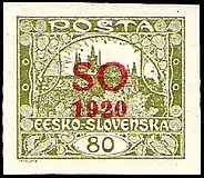 В феврале 1920 года для обеспечения нормального почтового сообщения в районах проведения плебисцита о государственной принадлежности спорного между Польшей и Чехословакией региона Восточной (Тешинской) Силезии марки были надпечатаны SO 1920 (сокращение от фр. Silésie Orientale). Существует четыре разновидности таких надпечаток, в том числе красного цвета[16].
