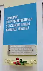 Гра́ждане! При артобстре́ле э́та сторона́ у́лицы наибо́лее опа́сна — надпись, наносившаяся в период блокады Ленинграда на стены многих зданий города с помощью трафарета.