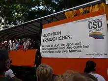 В апреле 2005 года правительство Баварии, одной из наиболее консервативных земель, подало иск в Конституционный суд Германии в Карлсруэ о проверке допустимости усыновления детей однополыми парами[14]. В августе 2009 года Конституционный суд постановил, что усыновление партнёрами кровных детей партнёра не противоречит Конституции страны[96]. Однако второй партнёр может усыновить биологического ребёнка своего партнёра только в том случае, если второй биологический родитель ребёнка не возражает против этого[90][95]. Ребёнок, достигший 14 лет, может самостоятельно решать, хочет ли он быть усыновленным или нет, независимо от решения второго биологического родителя[90].