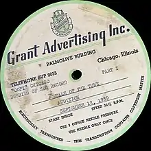 Также существовал формат пластинки 16″ (ок. 40 см). Это были диски для проигрывания записей на радиостанциях, так называемые Transcription disc. Частота вращения таких дисков составляла 33⅓ об/мин. Начали производить их ещё в 30-х годах. К 1940 году использовались для сопровождения звукового кино[10].