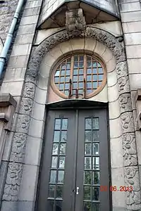 Отделка фасадов включает резьбу по камню с изображениями птиц и животных, а также растительным орнаментом (гирлянды из дубовых листьев с желудями, сосновые ветви с шишками, утиное гнездо с птенцами, козлиные и бараньи головы и т. д.). По проекту на первом этаже располагался большой зал с арочными окнами, через которые свет поступает с двух сторон. С улицы Северный Вал по облицованной мрамором лестнице за правой входной дверью посетители попадали в квартиру владельца фирмы, В. Хакмана, а левая дверь была входом в конторские помещения. Со стороны Подгорной улицы расположены третий вход в здание и проезд во двор. Украшениями дворового фасада стали массивный балкон и зелёная керамическая плитка. Подвальное помещение использовалось в качестве складского.