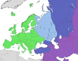 Некоторые источники используют другой вариант определения границы Европы — по водоразделу Уральского хребта, реке Урал[4], и водоразделу Кавказского хребта[5][6][7][8].