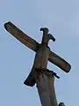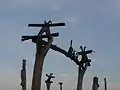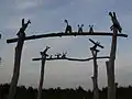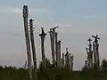 ...Одно из последних произведений, созданных художником и его соавторами в Никола-Ленивце, поражает ранее не свойственным Полисскому фаталистическим и довольно-таки мрачным духом. Грандиозная лэнд-артная инсталляция «Границы Империи», созданная Полисским для фестиваля «Арх-Стояние» 2007 года, представляла собой выросшее посреди слякотного весеннего поля скопление высоченных деревянных «колонн», увенчанных то условными двуглавыми орлами, то какими-то утыканными шипами цилиндрами и конусами, и напоминала не то индейское капище с тотемными столбами, не то место каких-то древних массовых казней с позорными столбами, виселицами и крестами для распятий. Полисский занимался, в сущности, тем, что снимал всевозможные границы, разделяющие природу и цивилизацию, местную культуру и универсальные традиции, извечные народные ремёсла и авторское современное искусство. Но для фестиваля, темой которого в тот год и была «Граница», он создал мощный и довольно-таки жуткий образ: лес пограничных столбов, яростно и словно бы вслепую «застобляющих» не столько чужое, сколько ничейное, необитаемое пространство и превратившихся то ли в объект поклонения, то ли в орудие устрашения. Но с какой бы слепой яростью ни вонзались в землю эти вехи, она так и не может обрести границы и очертания и остаётся беспредельной, безвидной и пустой.[5]