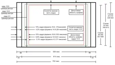 Сюжетно важная область Допустимая область титров Вертикальный Горизонтальный Вертикальный Горизонтальный 4:3 3.5% 3.3% 5.0% 6.7% 16:9 3.5% 3.5% 5.0% 10.0% 14:9 (выведено на 16:9) 3.5% 10.0% 5.0% 15.0% 4:3 (выведено на 16:9) 3.5% 15.0% 5.0% 17.5%