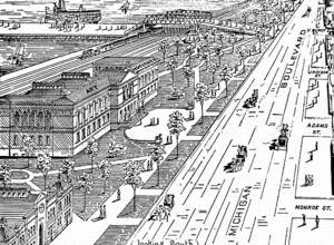 Первоначальные планы города Чикаго оставили район к востоку от Мичиган-авеню неразделённым и пустующим, а покупателям участков на Мичиган-авеню было обещано, что он останется незанятым. Когда в 1839 году бывший заповедник на месте форта Дирборн вошёл в состав городского поселения, план местности к востоку от Мичиган-авеню к югу от Рэндольфа был помечен как «Общественная территория. Должна всегда оставаться незастроенной»[~ 1].