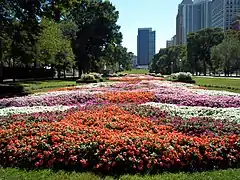 К юго-востоку от Института искусств, около Суда президентов, расположены демонстрационные сады, окружающие Иду Б. Уэллс-драйв и Букингемский фонтан, — это ряд регулярных садов, среди которых Сад празднования Тиффани на юге[25].