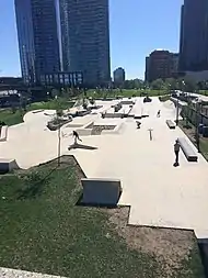 Консерватория обратилась за поддержкой в планировании со стороны местных скейтбордистов и BMX-байкеров, которые сформировали Скейт-комитет Грант-парка по охране природы и Консультативный совет скейт-комитета. Площадь расположена в юго-западном углу парка рядом с бывшим местом Центрального вокзала 1893 года и включает в себя куски известняка из бывшего железнодорожного терминала. Строительство площади обошлось в 2,65 млн $[31]. В 2014 году парк принимал участие в Маунтин-Дью-Скейт-Туре (англ. Mountain Dew Skate Tour), впервые вернувшегося в Чикаго с 2010 года, и в парковом туре «Volcom Wild», впервые появившемся в Чикаго[32][33].