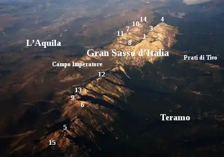 Восточнее основных горных вершин расстилается Кампо-Императоре (итал. Campo Imperatore) — самое обширное плато Апеннинского полуострова со старейшими горнолыжными курортами Италии. В отдалённой горнолыжной гостинице «Кампо-Императоре» (действующей и сегодня) после свержения был заключён Муссолини. Чтобы вызволить дуче из заточения, в 1943 году Отто Скорцени осуществил в этой труднодоступной местности высадку десанта с планеров.