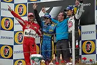 Алонсо, Шумахер и Баттон празднуют на подиуме. Баттон позже будет дисквалифицирован.