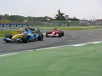 Alonso and Schumacher battle for the lead in the closing stages of the race