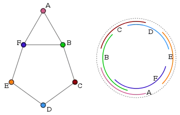 — множество дуг. Тогда соответствующий им граф дуг окружности — это G = (V, E), где
