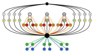 | Граф циклов группы S4, приведённый выше, подчёркивает наличие трёх Dih4 подгрупп. | ||