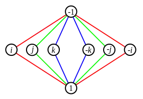 Может существовать неопределённость, если два цикла содержат элемент, не являющийся единичным элементом. Рассмотрим, например, группу кватернионов, граф циклов которой показан справа. Каждый элемент в среднем ряду, умноженный на себя, даёт −1. В этом случае мы можем использовать различные цвета для отражения циклов, хотя просто соглашение о симметрии будет работать так же хорошо.
