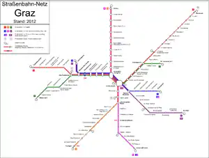 Трамвайная сеть Граца достигла своей максимальной протяженности в 1950 году. Рост доли горожан, владеющих автомобилями, а также развитие удалённых пригородов, не обслуживавшихся трамваями, привели к сокращению использования этого вида транспорта — и, в конечном итоге, к закрытию нескольких маршрутов. С 1941 года городские власти также вводили в эксплуатацию троллейбусные линии для связи с дальними частям Граца: в 1967 году они были заменены автобусами[1].