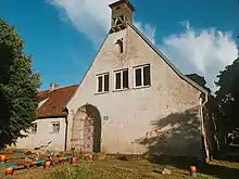 Бывшее здание школы в Грачёвке. С 2021 года под отвалившимся куском штукатурки видна фреска "Сеятель", выполненная после Первой мировой войны в память о погибших: сеятель как библейский символ победы жизни над смертью[3][4]
