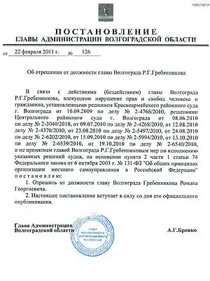 Вечером 22 февраля 2011 года стала появляться информация о том, что Анатолий Бровко подписал постановление «Об отрешении от должности главы Волгограда Р. Г. Гребенникова» с формулировкой «В связи с действиями (бездействиями), влекущими нарушение прав и свобод человека и гражданина, установленными решениями судов… и не принятием мер по исполнению указанных решений судов»,[48][49] то есть на основании пункта 2 части 1 статьи 74 Федерального закона «Об общих принципах организации местного самоуправления в Российской Федерации»[50].