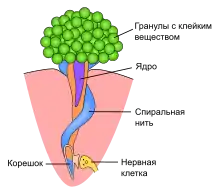 В эпидермисе тентилл и щупалец имеются многочисленные специализированные клетки — коллоциты, которые выделяют клейкое вещество и приклеиваются к добыче. Коллоциты, как и стрекающие клетки, формируются в эпидермисе в ходе дифференцировки интерстициальных клеток. Зрелый коллоцит состоит из вздутой апикальной части (шапочки), которая несёт многочисленные везикулы с клейким веществом, и более узкой «ножки», которая заякоривает коллоцит в эпидермисе, мышечном слое или мезоглее. Вокруг «ножки» спирально обвивается специальная нить, по-видимому, гасящая механическую нагрузку на коллоцит. Вероятно, каждый коллоцит используется только один раз и после этого заменяется новым[9].